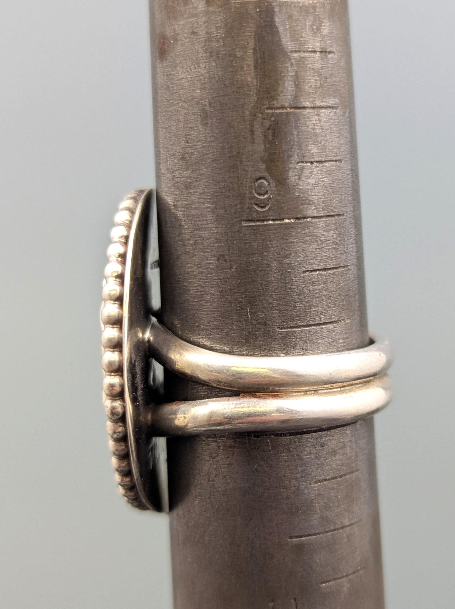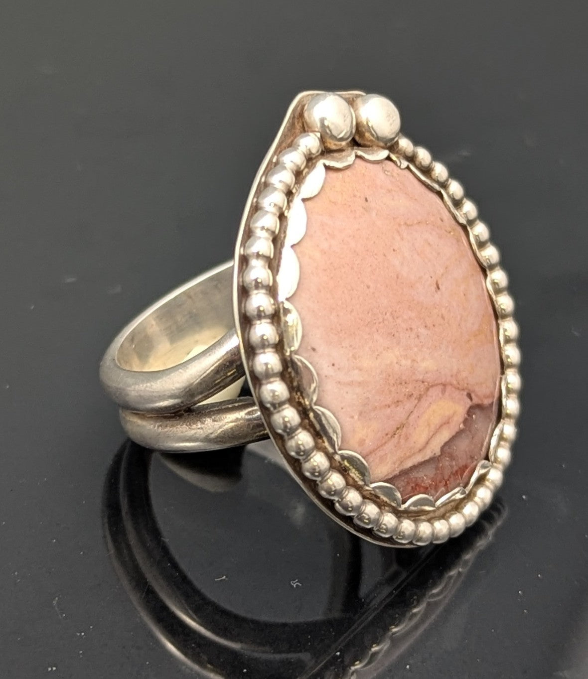 Pale pink rhodonite takes center stage in this elegant sterling silver ring. The natural stone is surrounded by delicate round bead wire detailing and secured in a scaled bezel setting crafted from solid 20 gauge silver. The substantial double band provides a sturdy foundation and comfortable fit. True size 10. Measures 1.25" high and 1" wide at the widest point. A timeless piece that celebrates the soft beauty of rhodonite.