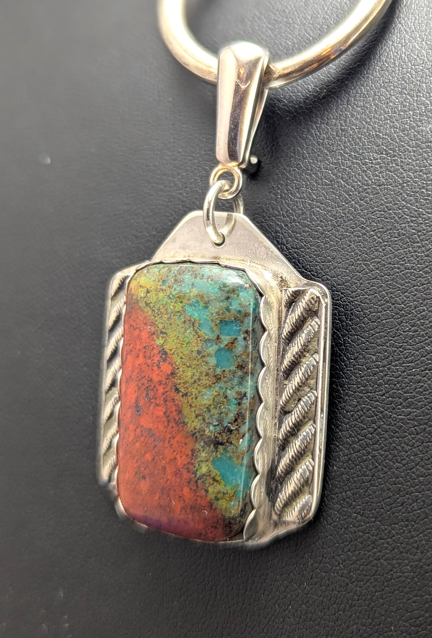 The Sonoran Sunset 40ct Sterling Silver Pendant features intricate decorative wire detailing along its sides, enhancing its unique handcrafted design. The clip-on style bale will slip on to any type of chain or beaded necklace making it a versatile piece. This expert craftsmanship highlights the vibrant colors of the Sonoran Desert’s sunrise and sunset, creating a one-of-a-kind piece that marries natural inspiration with refined artistry.
